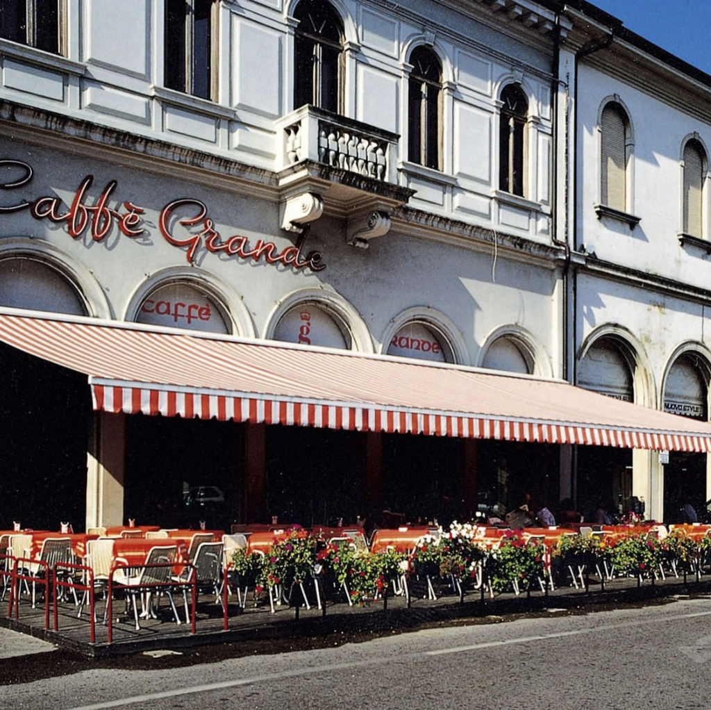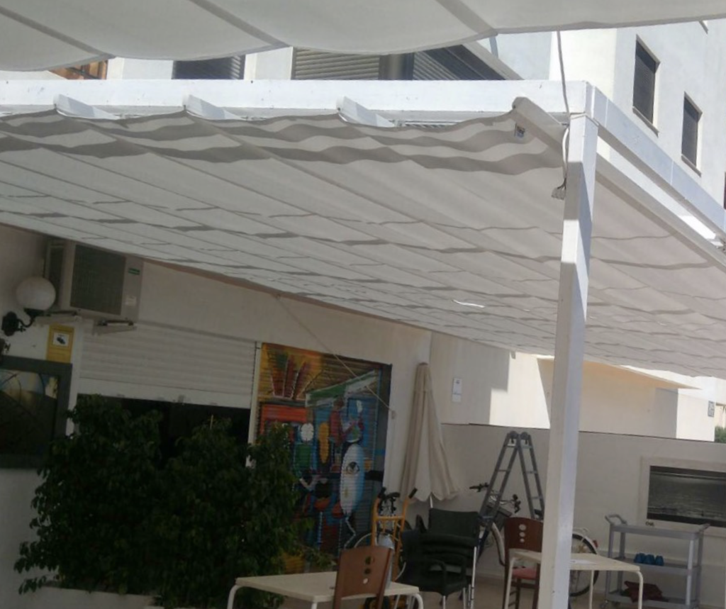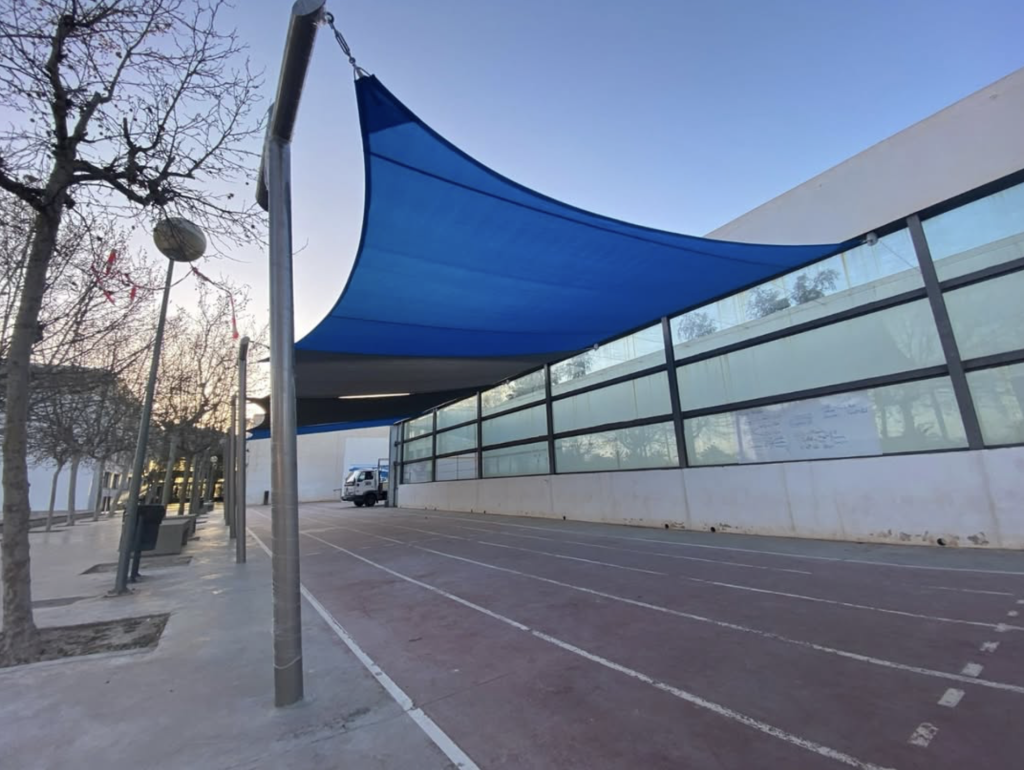 Sombra tensada en terraza exterior de restaurante. Color arena, tejido microperforado técnico de alta resistencia.