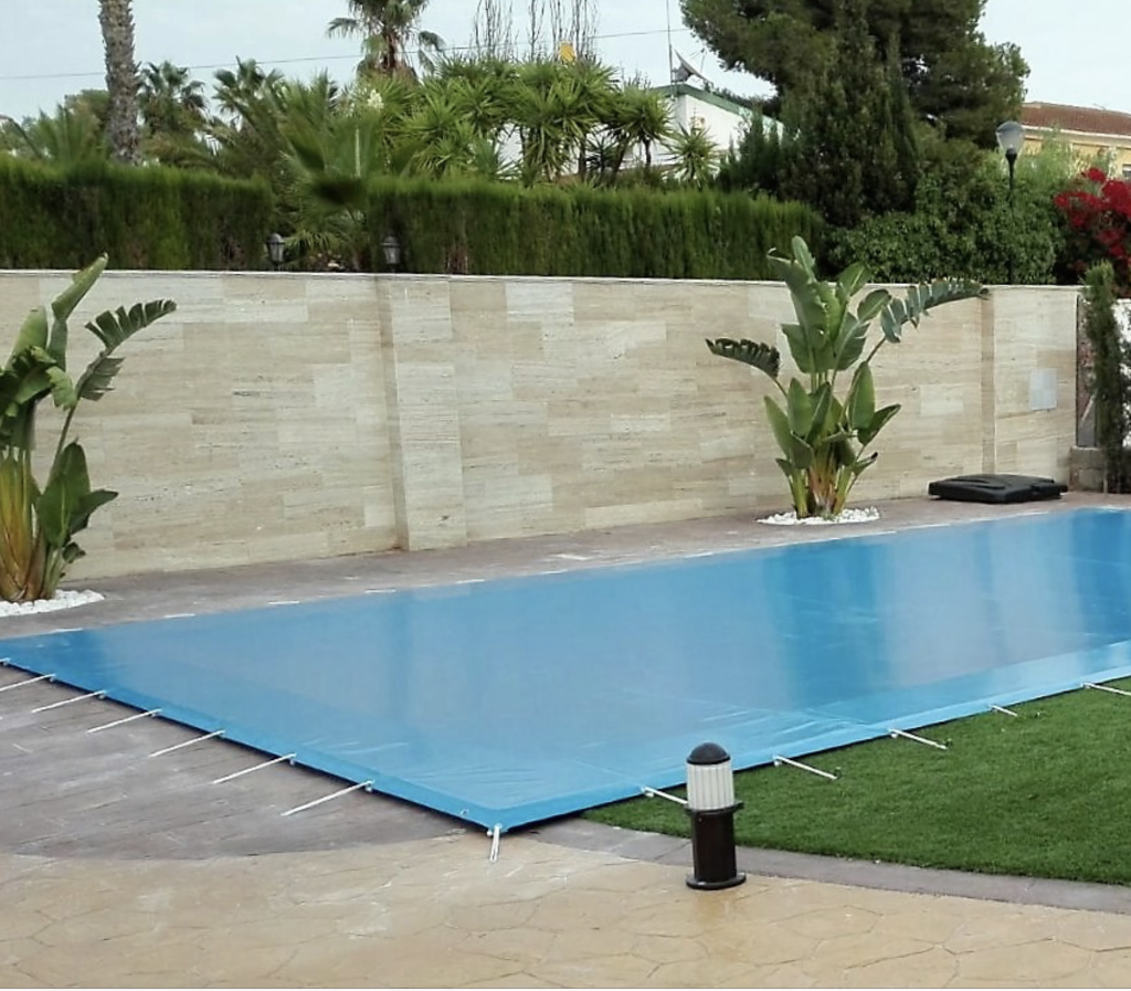 Cubierta de invierno de 7x3 m con ojales y tensores. Termosellada, reduce evaporación y mantiene limpia el agua.